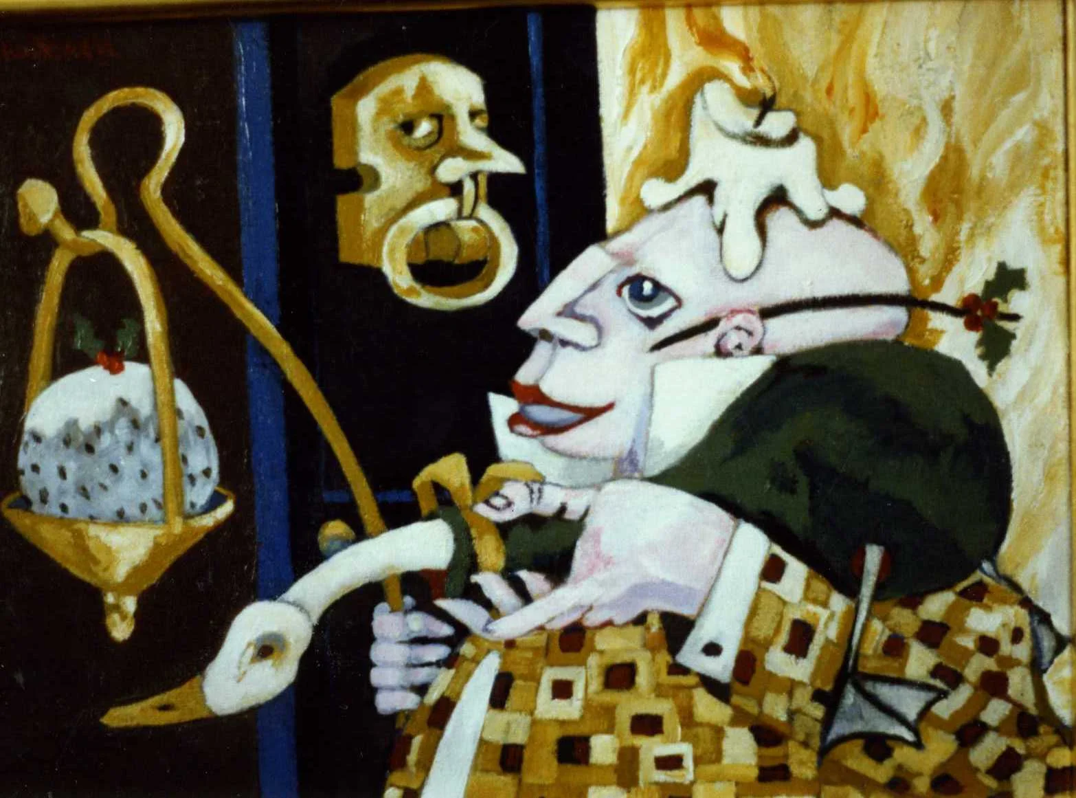 Christmas was a rare subject but not ignored. This is one of a couple of paintings that we know of with a Christmas theme. This one was turned into Christmas card and given to friends. The reference has to be to Charles Dickens' A Christmas Carol.
